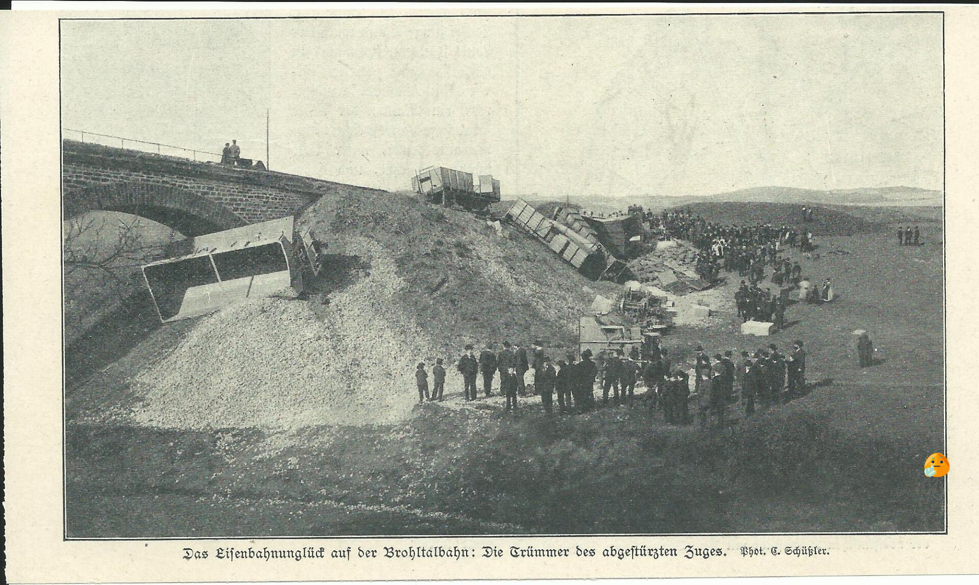 Der zur Karte vorher gehörende Original Zeitungsauschnitt von 1907 - Das Eisenbahnunglück auf der Brohltalbahn: Die Trümmer des abgestürzten Zuges - Phot. C. Schüssler