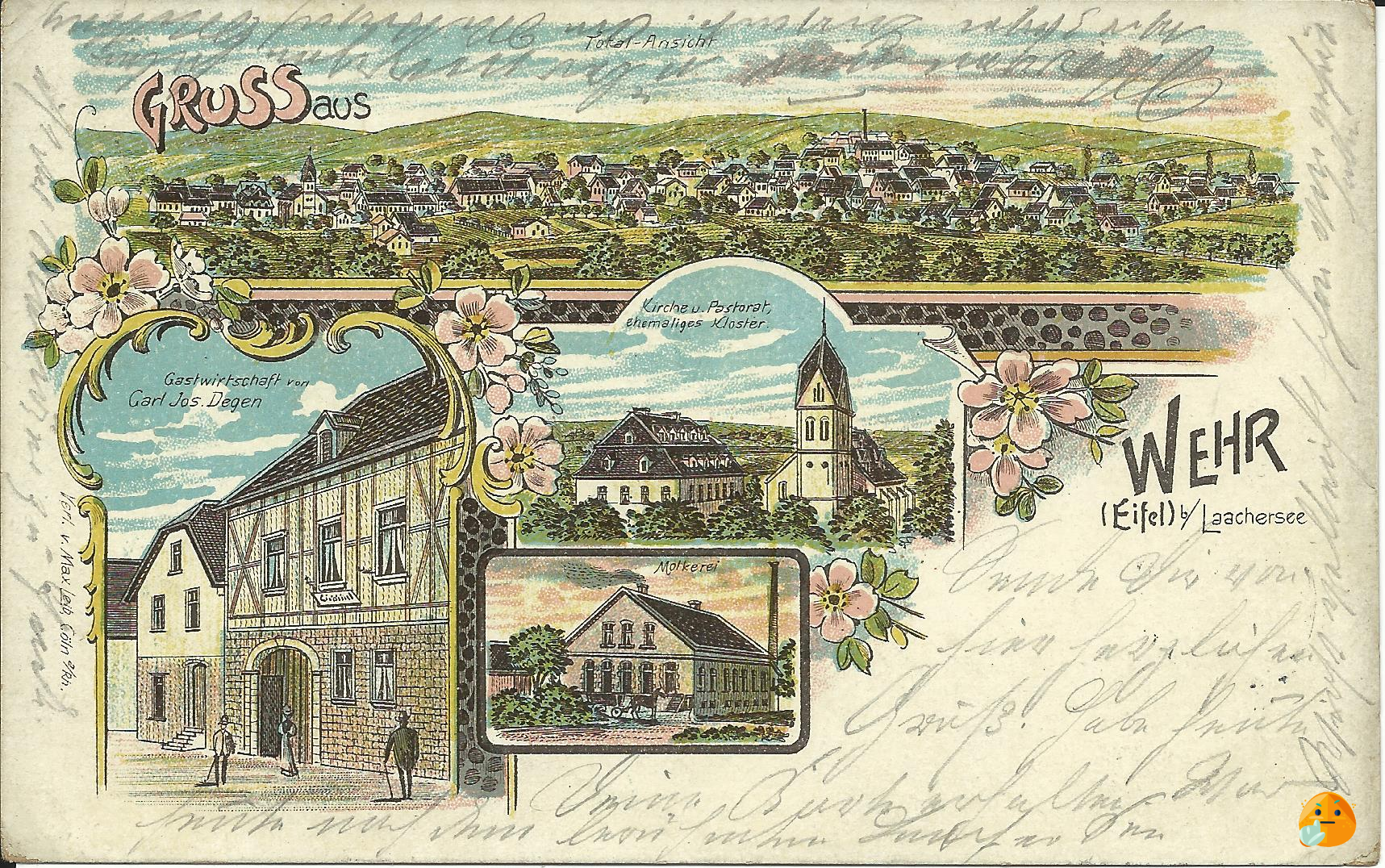 Lithographie Verlag von Max Leub, Cöln - Gruss aus Wehr mit Gastwirtschaft Degen, Kirche und Pastorat sowie der Molkerei - Am 15. Sept 1902 nach Rothau gesendet